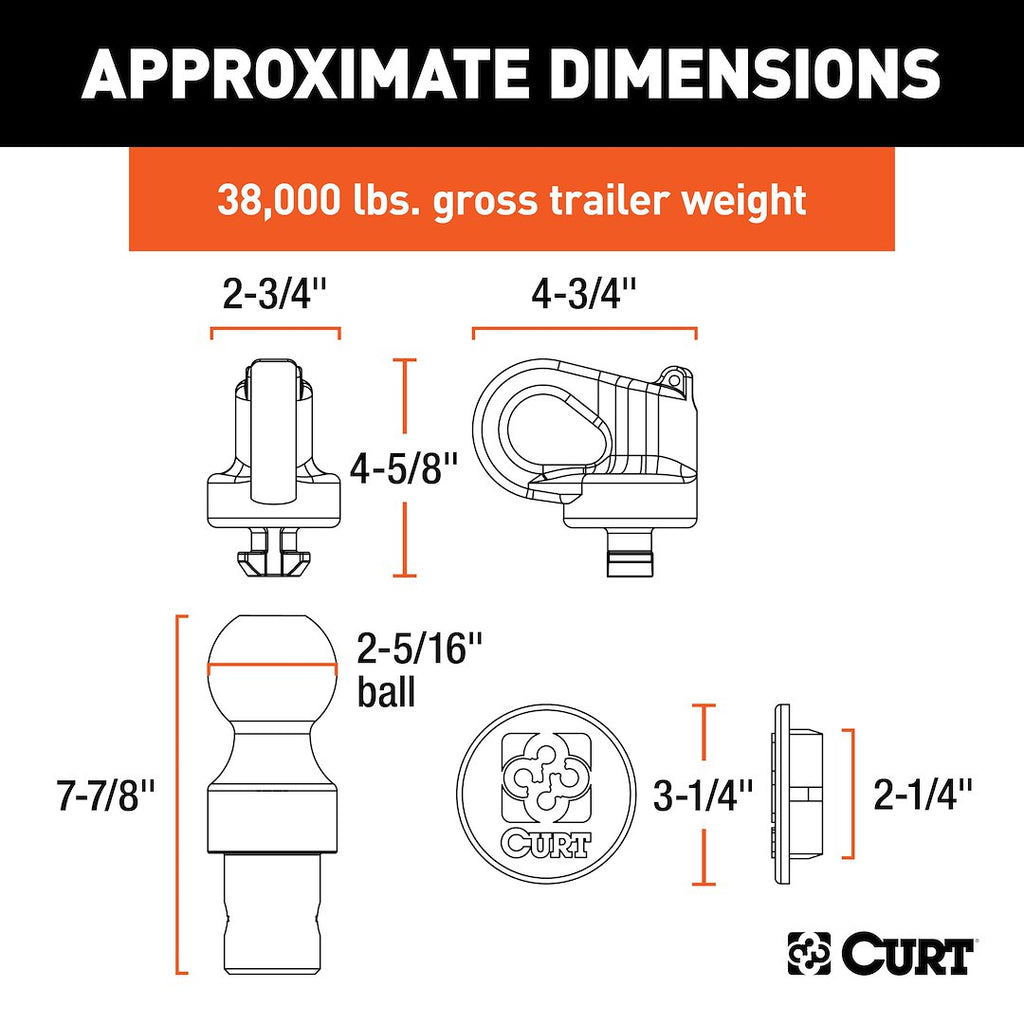 The CURT Gooseneck Trailer Hitch Ball is designed to enhance your towing capabilities with ease and reliability. This robust hitch ball kit is compatible with Chevy, Ford, GMC, and Nissan trucks equipped with the factory gooseneck hitch puck system, allowing for seamless gooseneck towing. With a gross trailer weight rating of 38,000 pounds and a vertical load capacity of 9,500 pounds, this hitch ball is engineered for strength and durability.