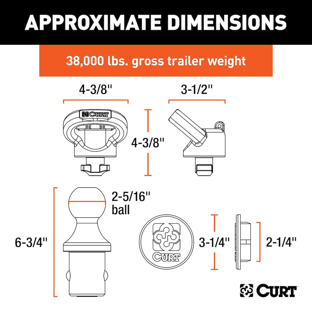 The CURT gooseneck trailer hitch ball kit is designed to enhance your towing capabilities with ease. This robust kit includes a gooseneck ball and safety chain loops that seamlessly integrate with the factory gooseneck hitch puck system found in Ram trucks equipped with the 5th wheel gooseneck hitch prep package. With a gross trailer weight capacity of 38,000 pounds, this gooseneck ball is engineered for strength and reliability.