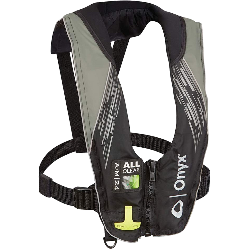 The Onyx Personal Floatation Device A M 24 All Clear is designed for adult users seeking reliable flotation support. This inflatable life jacket features a unique cylinder seal indicator window that provides a quick visual check, showing red or green to confirm the device is properly armed and ready for use. The jacket can convert from automatic/manual inflation to manual-only inflation, enhancing versatility for various water activities.