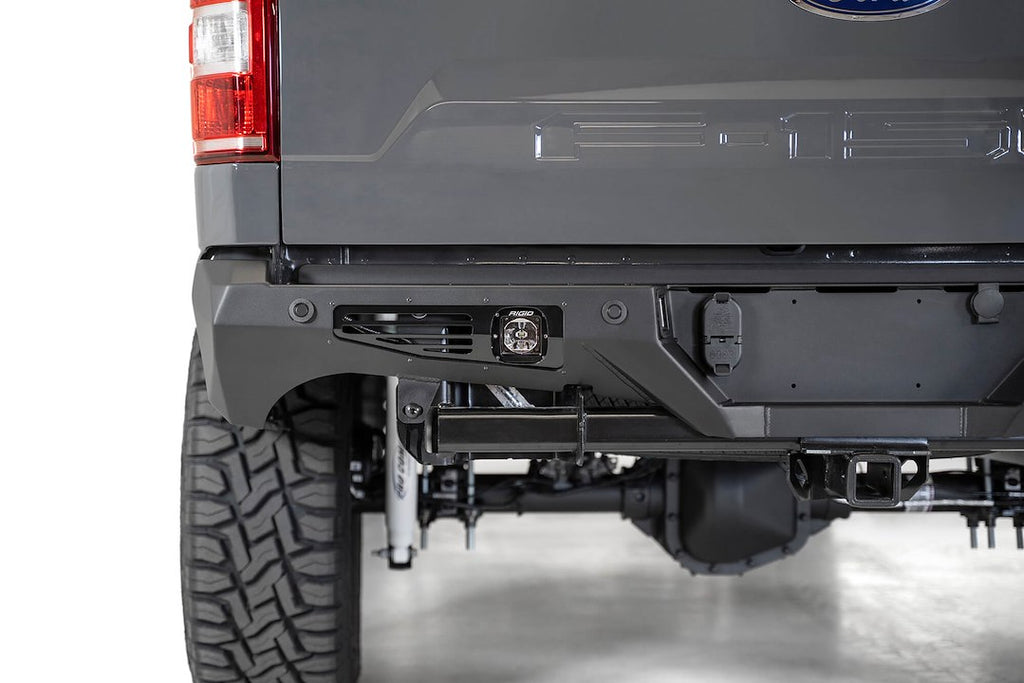 The Addictive Desert Designs Bomber Rear Bumper is designed specifically for the Ford F-150, combining modern aesthetics with robust functionality. This one-piece bumper features a sleek, low-profile design that seamlessly integrates with your vehicle's body lines, providing a factory-installed appearance. Constructed from durable plate steel and finished with a powder-coated hammer black, this bumper not only enhances the look of your truck but also offers added utility with its integrated light mounts and compatibility with factory features.