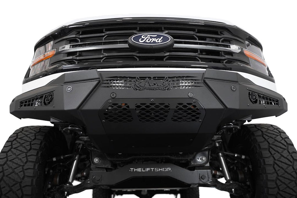 The Addictive Desert Designs HoneyBadger Front Bumper is engineered to elevate the exterior aesthetics of your Ford truck while providing robust functionality. This one-piece bumper features a low-profile design that seamlessly integrates with your vehicle's body lines, ensuring a unique and stylish appearance without compromising on quality.