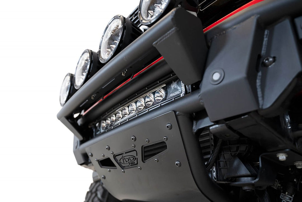 The Addictive Desert Designs Pro Series Front Bumper is engineered specifically for the 2021 and newer Ford Bronco, offering a robust and low-profile design that enhances both protection and aesthetics. This one-piece bumper is constructed from high-quality materials, ensuring durability and a perfect fit without the need for frame modifications.