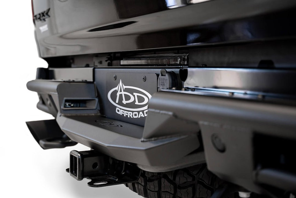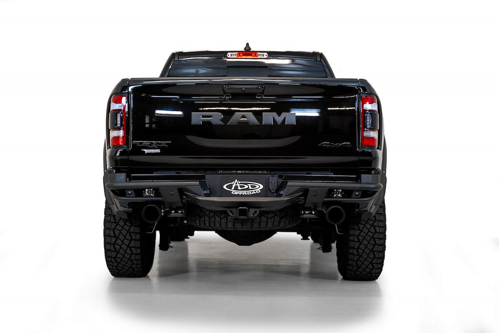 The Addictive Desert Designs Ram TRX PRO Bolt-On Rear Bumper is engineered to provide robust protection while maintaining a sleek, low-profile design. This one-piece bumper is crafted to seamlessly integrate with the contours of your truck, ensuring both style and functionality. Constructed from durable steel and aluminum, it offers solid rear-end protection while maximizing ground clearance. The bumper includes mounting points for rear-facing cube lights and retains the factory parking sensors and tow hooks for added convenience.