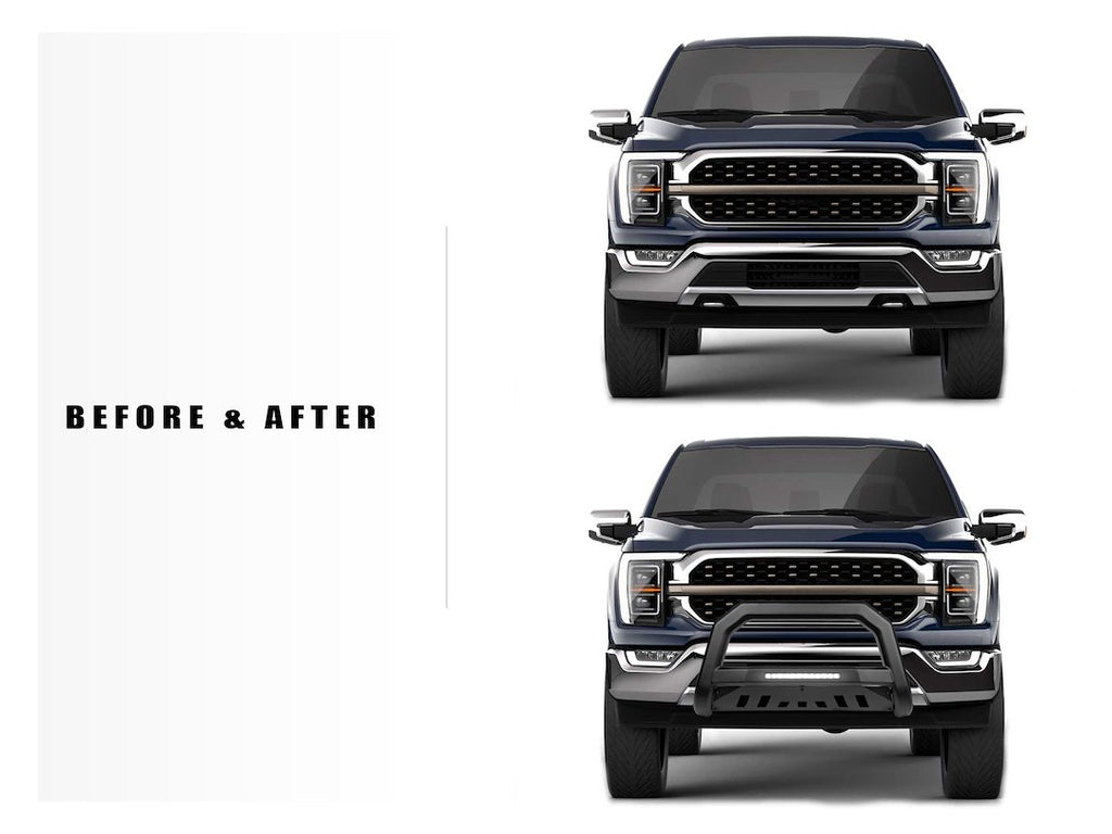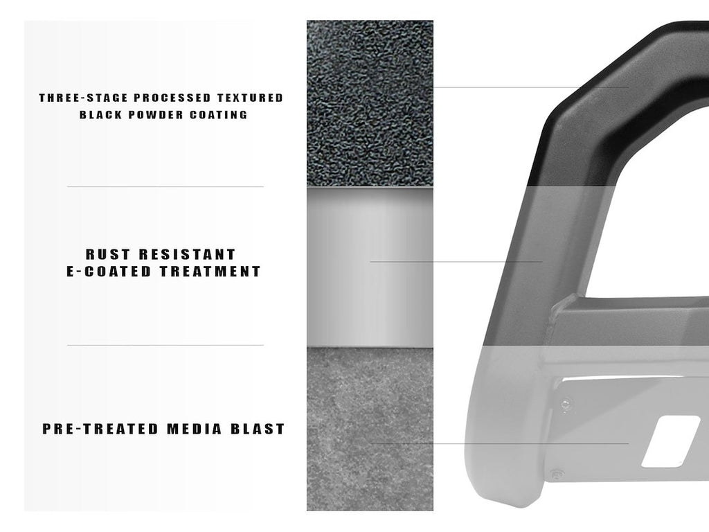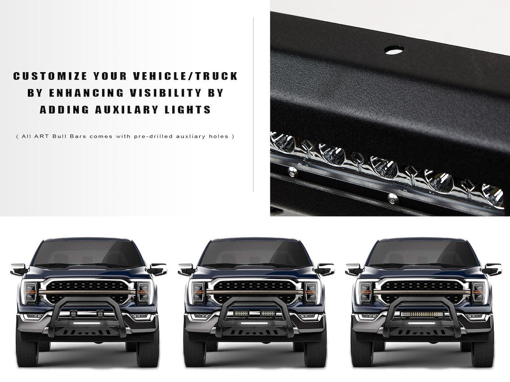 The Armordillo AR-T Bull Bar is designed to provide robust front-end protection against minor collisions, debris, and wildlife. Constructed using advanced Forge Pressed technology, this bull bar ensures durability and strength for various road conditions. It features a built-in 12-inch LED light bar and pre-drilled holes for additional auxiliary lights, enhancing visibility during nighttime driving. The three-stage powder coating offers superior resistance to rust and corrosion, maintaining its sleek matte black finish over time.