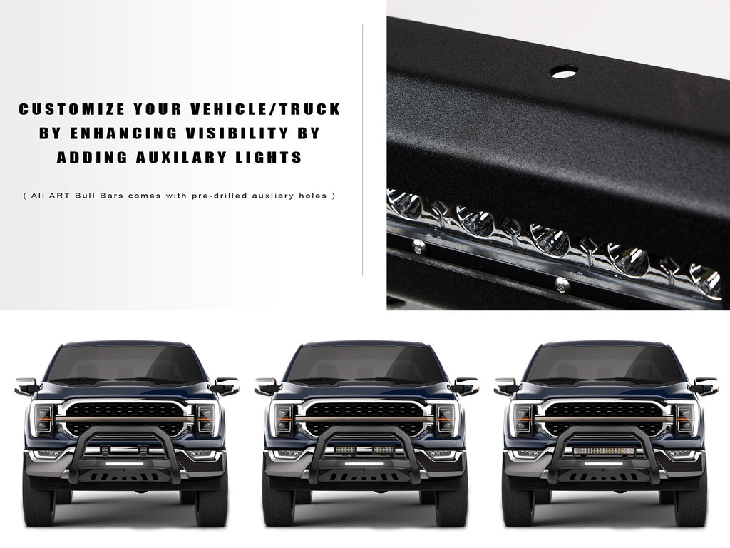The Armordillo AR-T Bull Bar is designed to provide robust front-end protection against minor collisions, debris, and wildlife. Constructed using advanced Forge Pressed technology, this bull bar ensures durability and strength for various road conditions. It features a built-in 12-inch LED light bar and additional mounting options for auxiliary lights, enhancing visibility during nighttime driving. The three-stage powder coating offers superior resistance to rust and corrosion, maintaining its sleek matte black finish over time.