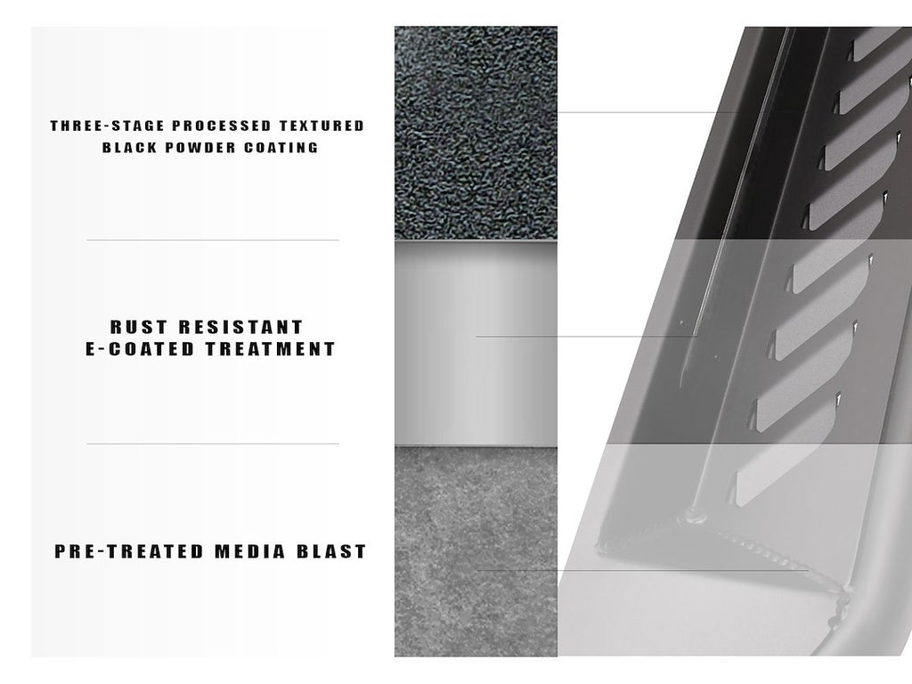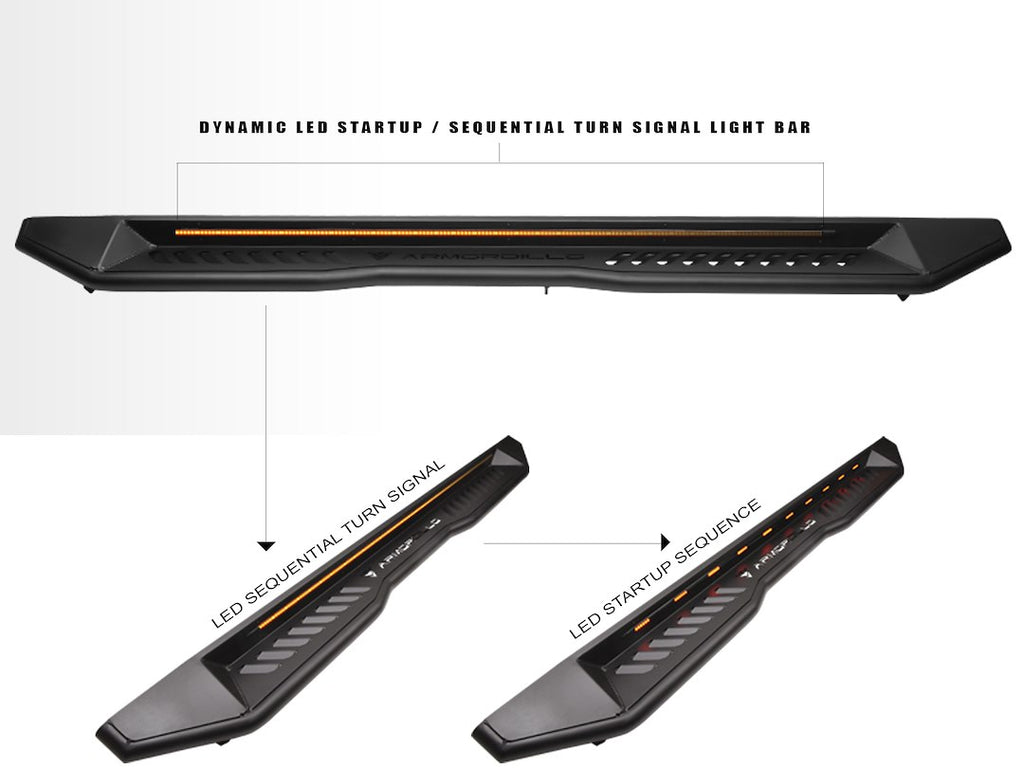 The Armordillo FX Series Running Board with LED Light Strip offers a robust solution for accessing your vehicle while enhancing its aesthetic appeal. Constructed from high-quality steel and featuring a sleek matte black powder-coated finish, these running boards provide both durability and style. The integrated multifunction LED light strip ensures safe entry and exit, illuminating your steps with a unique startup sequence and sequential turn signal functionality.