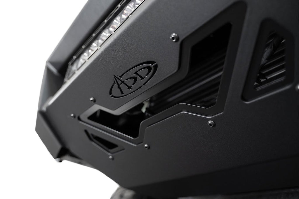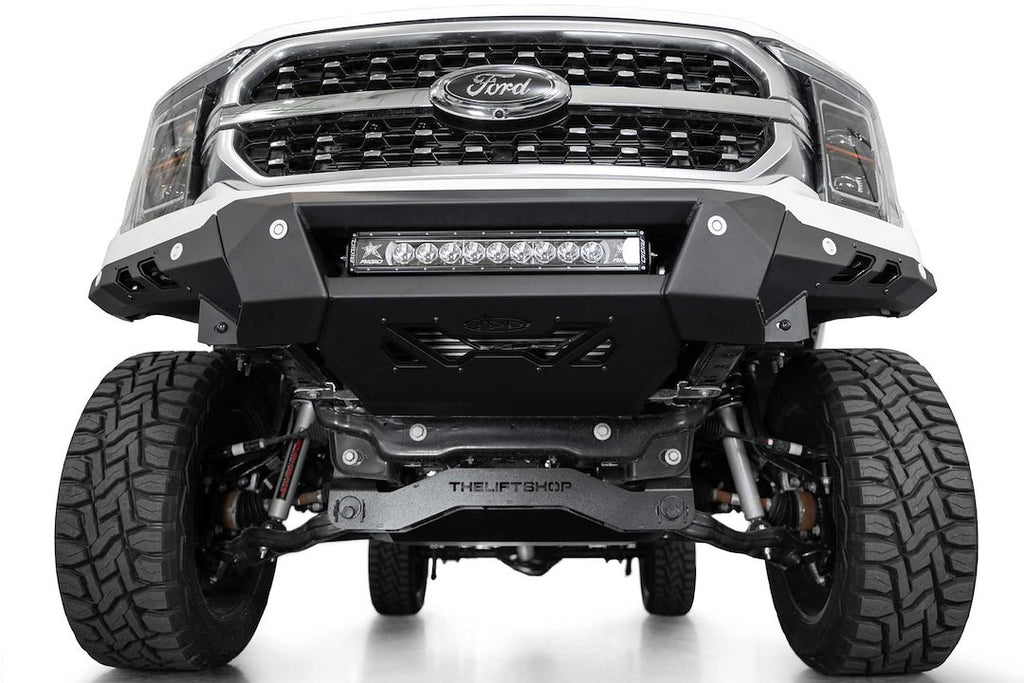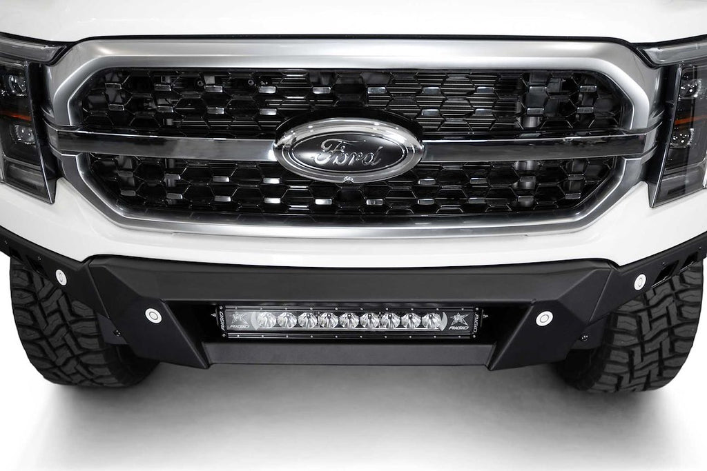 The Black Label Ford F-150 Front Bumper is engineered to complement the factory design while providing a seamless fit and straightforward installation. This three-piece bumper features a dedicated mount for a 20-inch LED light bar, enhancing visibility for off-road adventures or work environments. The design retains the functionality of OEM parking sensors and is compatible with adaptive cruise control when paired with the F-150 ACC Relocation Bracket (sold separately).