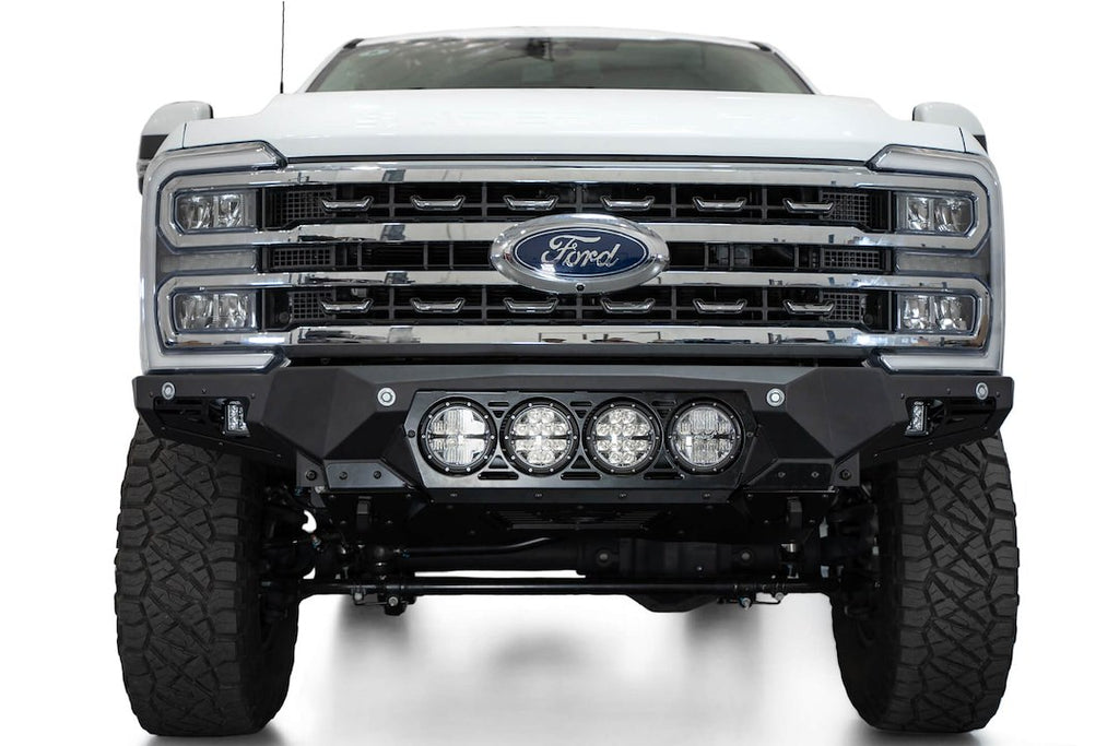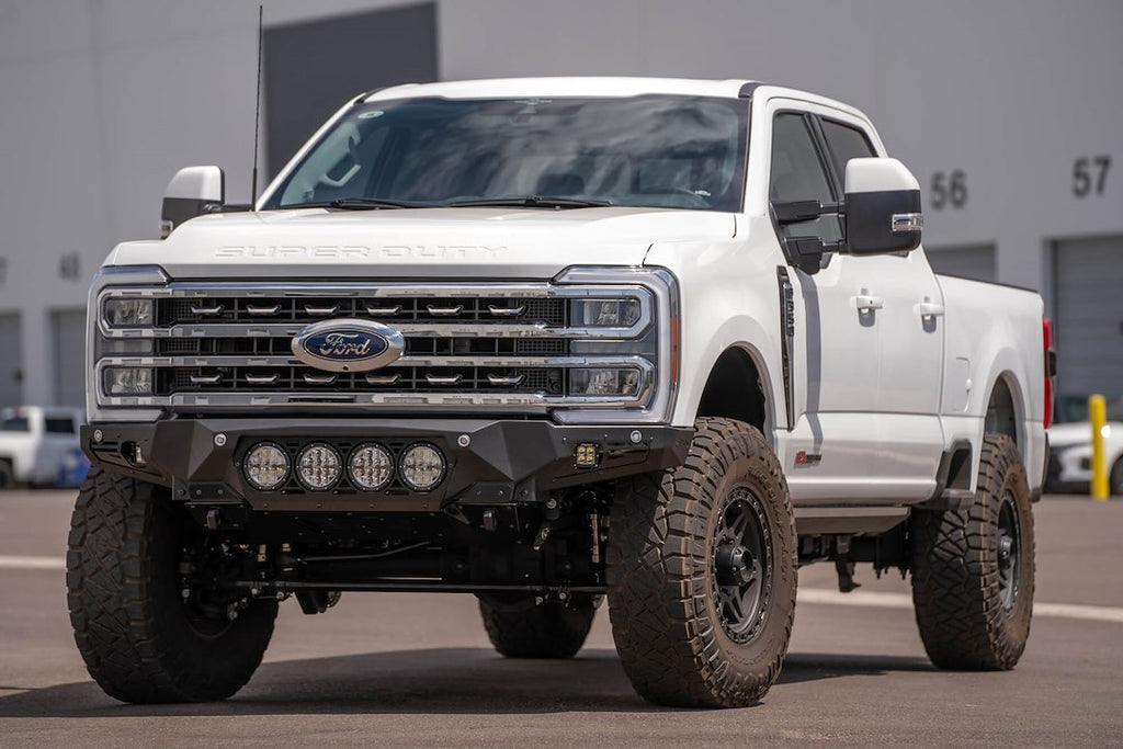 The Bomber Ford Super Duty Front Bumper is designed to provide robust protection while enhancing the aggressive appearance of your truck. This one-piece bumper features multiple mounting options for lights, ensuring optimal visibility on and off the road. Constructed from durable materials and finished with a sleek powder coat, it is engineered for direct fitment and easy installation.