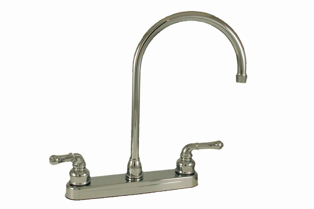 The Empire Faucet 10-2372 is a high-quality kitchen faucet designed for durability and ease of use. This single-piece, 8-inch deck-mount faucet features a gooseneck spout and two teapot handles, making it a practical addition to any kitchen setup.