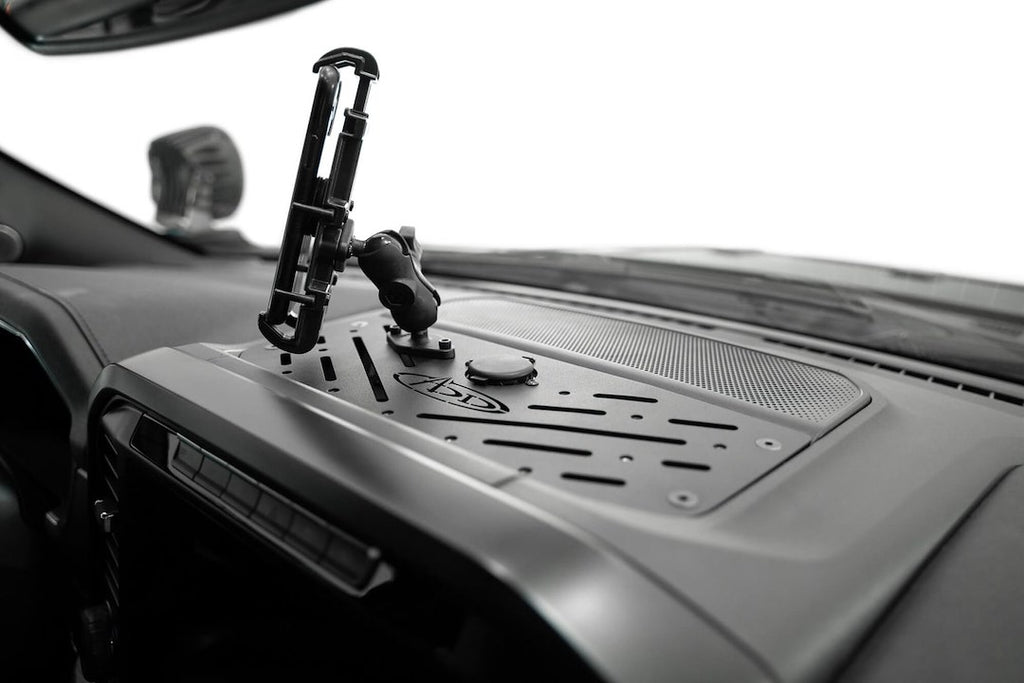 This Mobile Electronics Device Mount Base is designed to provide easy access to your communication, navigation, and information devices while on the road or trail. Specifically crafted for the 2021+ Ford F-150 and 3rd Gen Raptor, this dash mount allows you to keep your handheld devices within reach, ensuring a seamless driving experience.