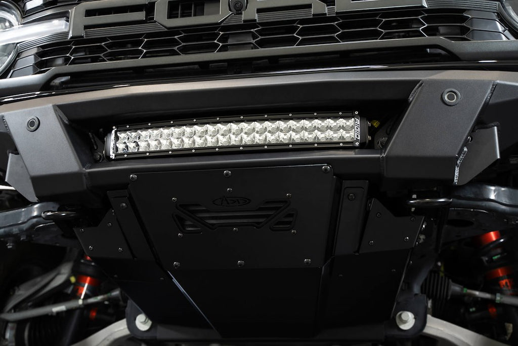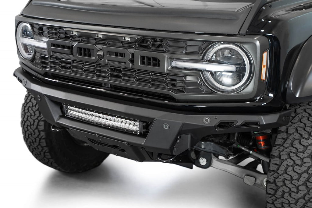 The Phantom Series Bronco Raptor Front Bumper is designed to provide superior protection while enhancing the aggressive appearance of your Raptor. This one-piece bumper features a low-profile, knife's edge design that sets it apart from factory options. It includes an inset mounting point for a 20-inch LED light bar or five 3-inch light pods, ensuring optimal visibility during off-road adventures. Constructed from durable steel and finished with a powder-coated hammer black, this bumper is built to withstand the rigors of off-road use.