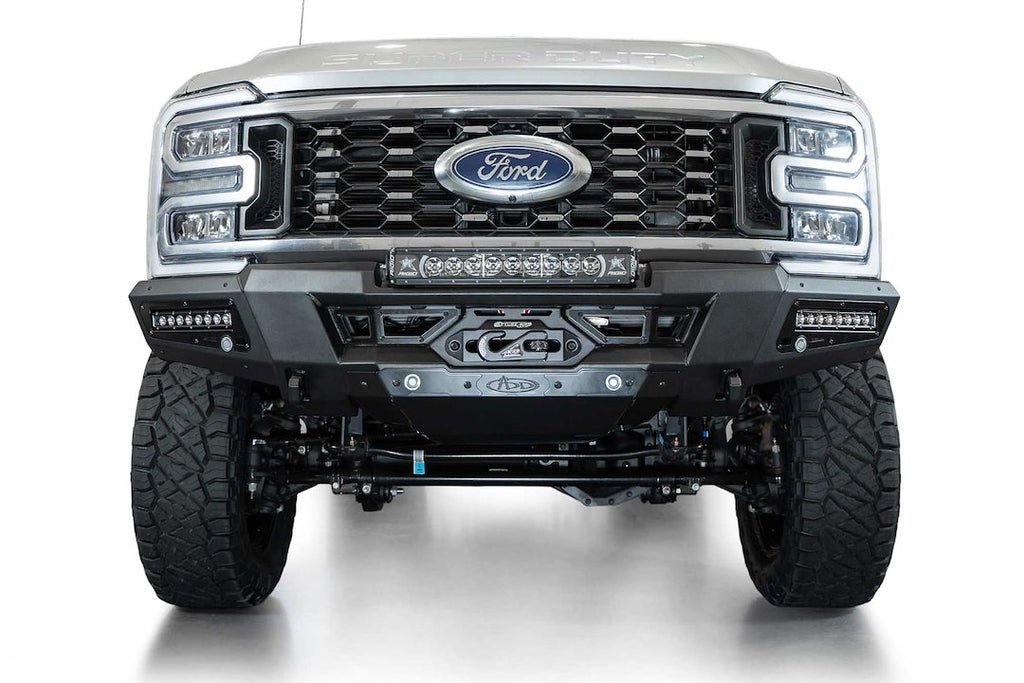 The Phantom Series Super Duty Winch Front Bumper combines robust construction with functional design, making it a valuable addition to your vehicle. This one-piece bumper features a low-profile, knife's edge design that enhances the overall aesthetics while providing essential utility. It is engineered for a direct-fit, bolt-on installation, ensuring a hassle-free setup.