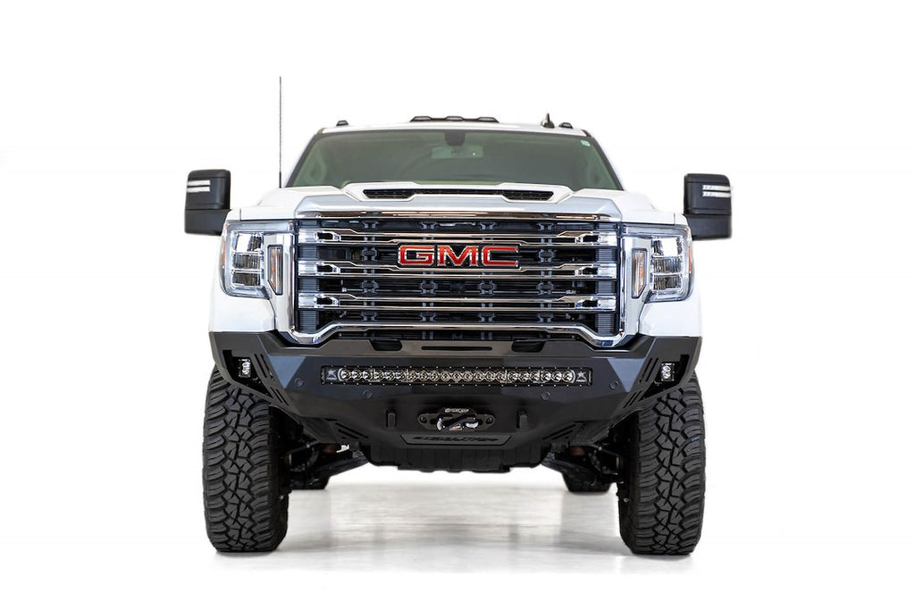 The Stealth Fighter Bumper by Addictive Desert Designs is engineered specifically for GMC 2500 and 3500 models, offering a robust and stylish front-end solution. This one-piece design features a powder-coated hammer black steel finish with satin black panels, ensuring both durability and a sleek appearance. The bumper includes a universal light mount that accommodates either a 40-inch light bar or up to 10 cube lights, enhancing visibility and functionality. With its direct-fit installation and included mounting hardware, this bumper is designed for easy, bolt-on application.
