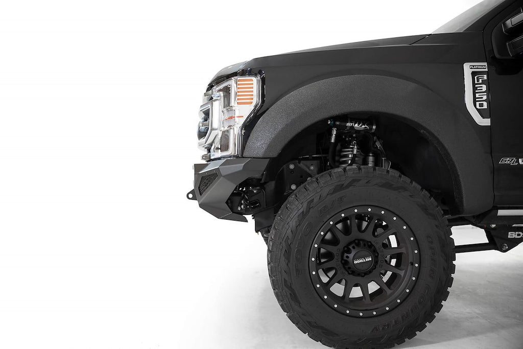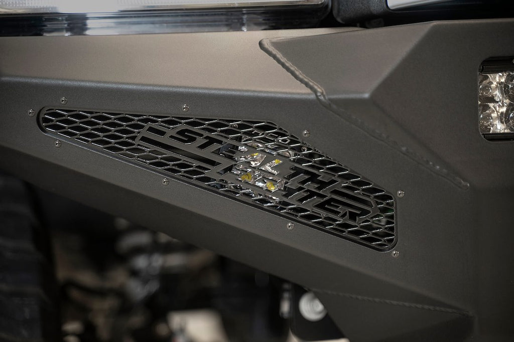 The Stealth Fighter front bumper is designed specifically for the Ford Super Duty, offering a sleek and modern look while providing superior front-end protection. This one-piece bumper features a radius plate steel design that aligns perfectly with the factory body lines, ensuring a seamless fit. With the ability to mount a 40-inch radius light bar or up to 10 cube lights, this bumper enhances your vehicle's lighting capabilities without compromising style. Installation is straightforward with a fully bolt-on design, eliminating the need for cutting or welding.