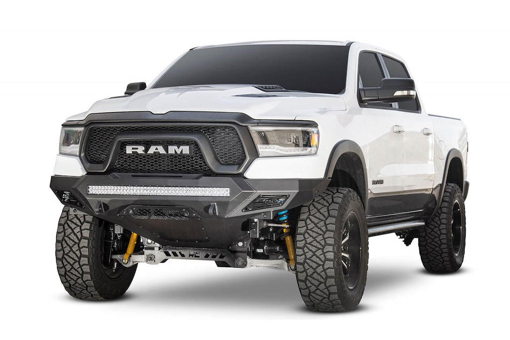 The Stealth Fighter front bumper is designed specifically for the RAM Rebel, providing a sleek and modern look while enhancing front-end protection. This one-piece bumper features a radius steel plate design that seamlessly integrates with the factory body lines of your truck. With the ability to mount a 40-inch radius light bar or up to 10 cube lights, this bumper offers both functionality and style.