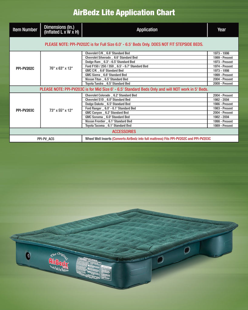 The Truck Bed Air Mattress by AirBedz is designed to maximize the sleeping area in your pick-up truck, providing a comfortable and spacious solution for outdoor enthusiasts. With its innovative design, this air mattress fits around and over the wheel wells, ensuring that you can utilize the entire truck bed for a restful night's sleep.