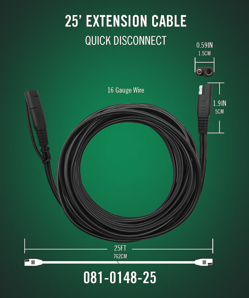 Constructed with a robust SAE Quick Disconnect harness, this extension cable ensures a reliable connection between the charger and the battery. The black color of the cable adds a sleek look while maintaining visibility in various environments. This product is ideal for users who require additional length to position their battery charger conveniently, ensuring that charging can be done efficiently and effectively.