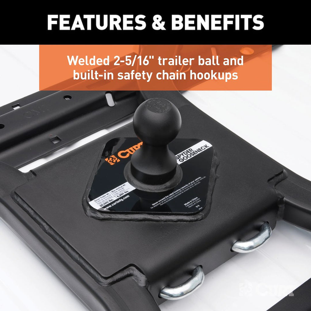 The CURT Gooseneck Trailer Hitch is designed to enhance the towing capabilities of pickup trucks equipped with 5th wheel rails. This innovative adapter allows for the towing of both 5th wheel and gooseneck trailers, providing flexibility for various hauling needs. With a gross trailer weight capacity of 25,000 pounds and a tongue weight capacity of 6,250 pounds, this hitch is engineered for heavy-duty performance.