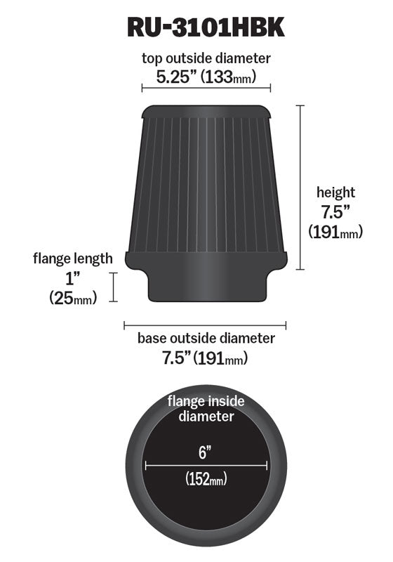 The K and N Filters RU3101HBK is a high-quality air filter designed for a wide range of applications, including racing vehicles, radio-controlled cars, generators, snowmobiles, and tractors. This round tapered air filter features a robust construction that ensures optimal airflow and filtration efficiency.