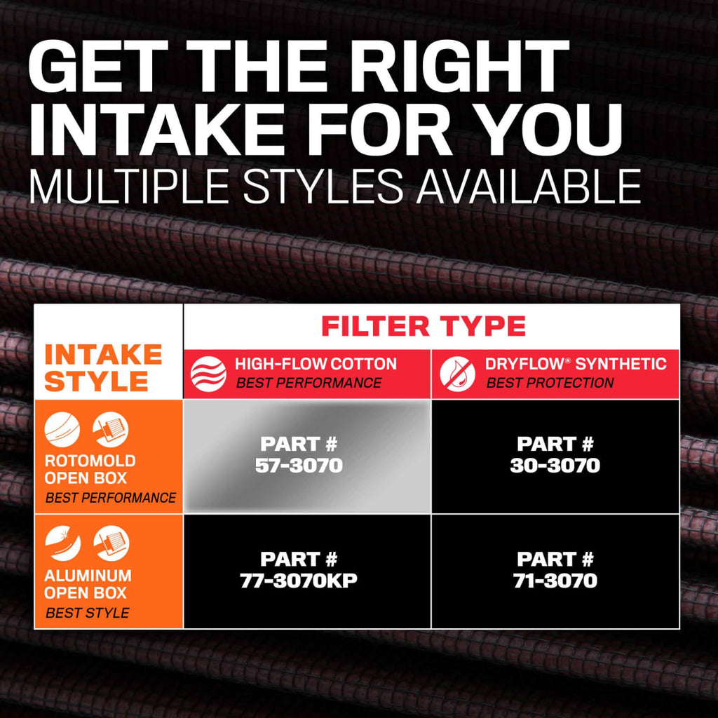 - Roto-molded HDPE intake tube paired with oversized oiled cotton air filter