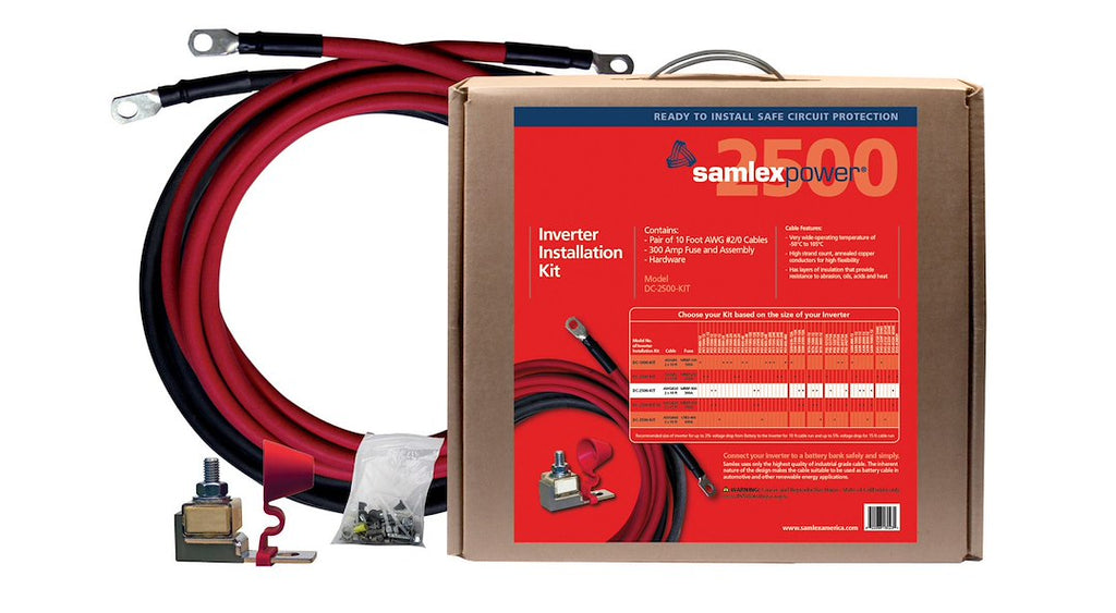 The Samlex Inverter Installation Kit is designed for efficient and secure installation of power inverters ranging from 12 Volt/1700 to 2500 Watt and 24 Volt/3400 to 5000 Watt. This kit includes two heavy duty 10-foot 2/0 AWG wires, ensuring a robust connection to the battery bank. A 300 Amp fuse block is included to protect your equipment from potential battery short-circuits, enhancing safety during operation.